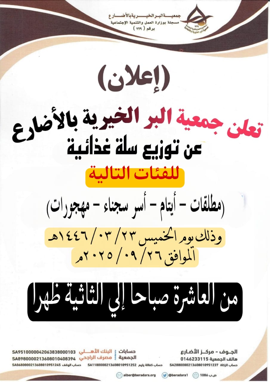 إعلان توزيع السلة الرمضانيةالمدعومة من مؤسسة الغويري الخيرية